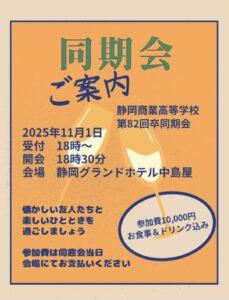 《静商第86回卒 同期会開催のご案内》 このたび、下記の通り同期会を開催する運びとなりました。 懐かしい思い出を語り合い、旧交を温めるひとときにしたいと存じます。 お誘い合わせのうえ、ご出席くださいますようご案内申し上げ …