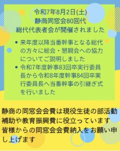 令和7年8月2日(土) 靜商同窓会80回代総代代表者会が開催されました ・来年度以降当番幹事となる総代の方々に総会・懇親会 への協力についてご説明しました ・令和7年度幹事83回卒実行委員長から令和8年度 幹事84回 …